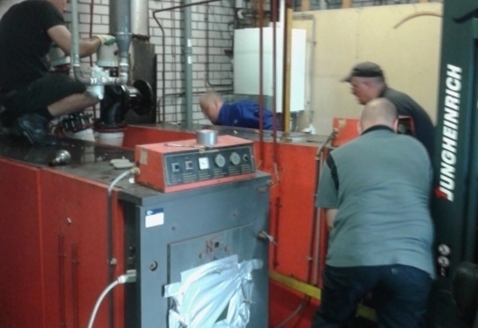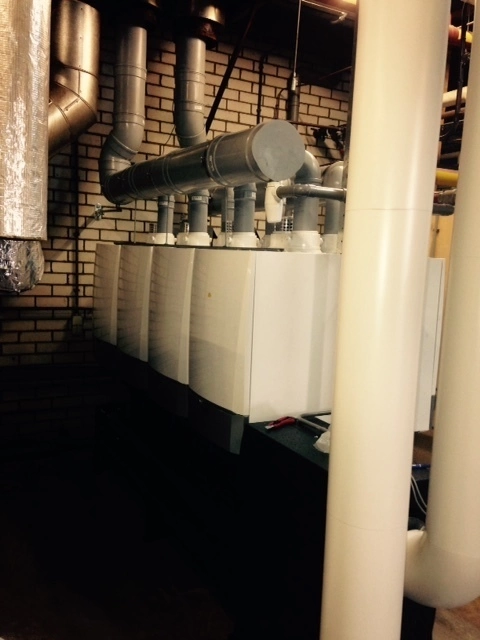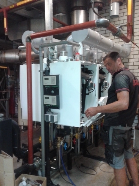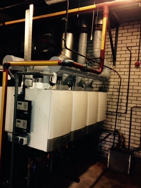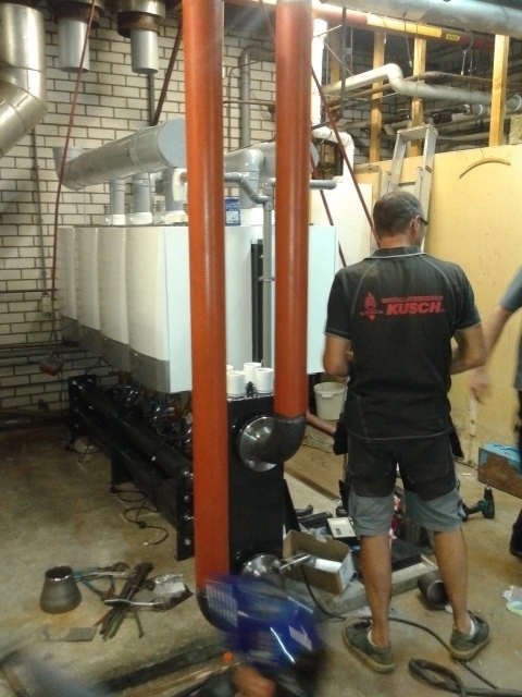 Wij hebben deze mooie opdracht mogen uitvoeren voor het vervangen van de 2 stuks oude conventionele cv-ketels door 8 stuks nieuwe Remeha Quinta Pro HR (Hoog Rendement) cv-ketels welk in cascade (rug links) gemonteerd zijn. Vooraf was het demonteren van de bestaande cv-ketels nog een hele ingreep, de grote staande cv-ketels zijn geheel uit elkaar gehaald en afgevoerd.